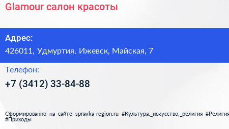 Glamour, салон красоты по адресу 426011, Удмуртия, Ижевск, Майская, 7 в дальнейшем Организация, размещена в следующих категориях: