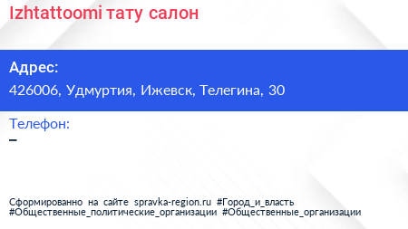 Izhtattoomi, тату-салон по адресу 426006, Удмуртия, Ижевск, Телегина, 30 в дальнейшем Организация, размещена в следующих категориях: