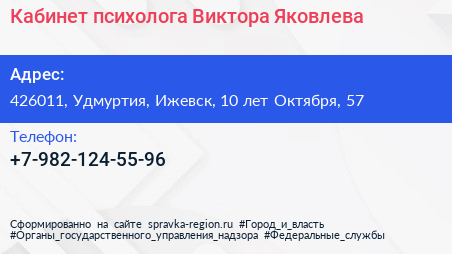 Кабинет психолога Виктора Яковлева по адресу 426011, Удмуртия, Ижевск, 10 лет Октября, 57 в дальнейшем Организация, размещена в следующих категориях: