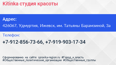 Kitinka, студия красоты по адресу 426067, Удмуртия, Ижевск, им. Татьяны Барамзиной, 3а в дальнейшем Организация, размещена в следующих категориях: