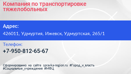 Компания по транспортировке тяжелобольных по адресу 426011, Удмуртия, Ижевск, Удмуртская, 265/1 в дальнейшем Организация, размещена в следующих категориях: