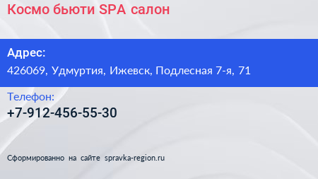 Космо бьюти, SPA-салон по адресу 426069, Удмуртия, Ижевск, Подлесная 7-я, 71 в дальнейшем Организация, размещена в следующих категориях:
