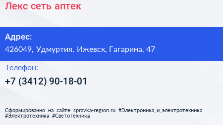 Лекс, сеть аптек по адресу 426049, Удмуртия, Ижевск, Гагарина, 47 в дальнейшем Организация, размещена в следующих категориях: