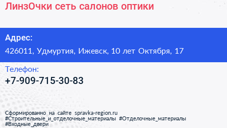 ЛинзОчки, сеть салонов оптики по адресу 426011, Удмуртия, Ижевск, 10 лет Октября, 17 в дальнейшем Организация, размещена в следующих категориях: