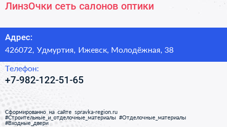 ЛинзОчки, сеть салонов оптики по адресу 426072, Удмуртия, Ижевск, Молодёжная, 38 в дальнейшем Организация, размещена в следующих категориях: