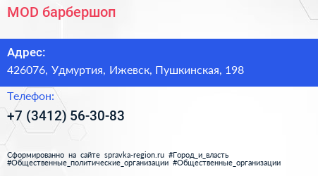 MOD, барбершоп по адресу 426076, Удмуртия, Ижевск, Пушкинская, 198 в дальнейшем Организация, размещена в следующих категориях: