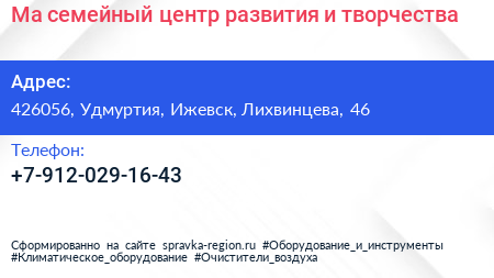 Ма, семейный центр развития и творчества по адресу 426056, Удмуртия, Ижевск, Лихвинцева, 46 в дальнейшем Организация, размещена в следующих категориях: