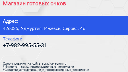 Магазин готовых очков по адресу 426035, Удмуртия, Ижевск, Серова, 46 в дальнейшем Организация, размещена в следующих категориях:
