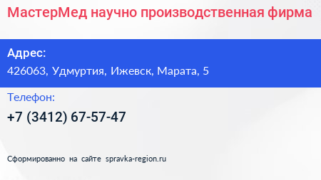 МастерМед, научно-производственная фирма по адресу 426063, Удмуртия, Ижевск, Марата, 5 в дальнейшем Организация, размещена в следующих категориях: