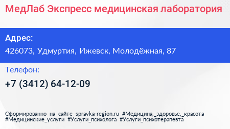 МедЛаб Экспресс, медицинская лаборатория по адресу 426073, Удмуртия, Ижевск, Молодёжная, 87 в дальнейшем Организация, размещена в следующих категориях: