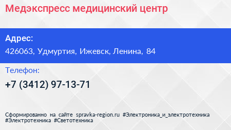 Медэкспресс, медицинский центр по адресу 426063, Удмуртия, Ижевск, Ленина, 84 в дальнейшем Организация, размещена в следующих категориях: