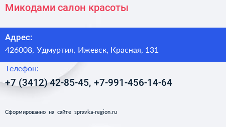 Микодами, салон красоты по адресу 426008, Удмуртия, Ижевск, Красная, 131 в дальнейшем Организация, размещена в следующих категориях: