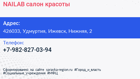 NAILAB, салон красоты по адресу 426033, Удмуртия, Ижевск, Нижняя, 2 в дальнейшем Организация, размещена в следующих категориях: