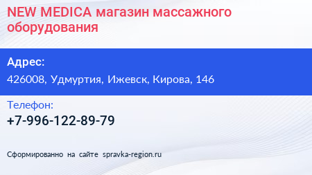 NEW MEDICA, магазин массажного оборудования по адресу 426008, Удмуртия, Ижевск, Кирова, 146 в дальнейшем Организация, размещена в следующих категориях:
