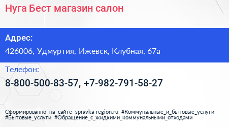 Нуга Бест, магазин-салон по адресу 426006, Удмуртия, Ижевск, Клубная, 67а в дальнейшем Организация, размещена в следующих категориях: