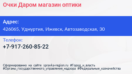Очки Даром, магазин оптики по адресу 426065, Удмуртия, Ижевск, Автозаводская, 30 в дальнейшем Организация, размещена в следующих категориях: