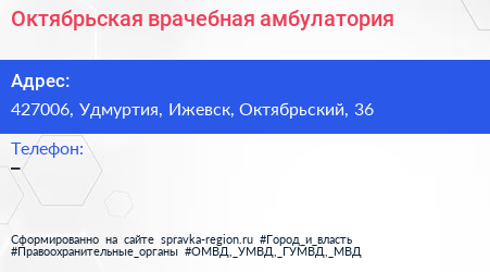 Октябрьская врачебная амбулатория по адресу 427006, Удмуртия, Ижевск, Октябрьский, 36 в дальнейшем Организация, размещена в следующих категориях: