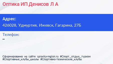 Оптика, ИП Денисов Л.А. по адресу 426028, Удмуртия, Ижевск, Гагарина, 27Б в дальнейшем Организация, размещена в следующих категориях: