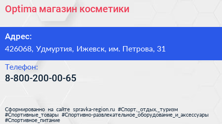 Optima, магазин косметики по адресу 426068, Удмуртия, Ижевск, им. Петрова, 31 в дальнейшем Организация, размещена в следующих категориях: