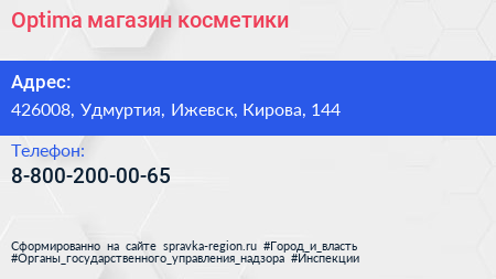 Optima, магазин косметики по адресу 426008, Удмуртия, Ижевск, Кирова, 144 в дальнейшем Организация, размещена в следующих категориях: