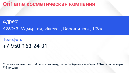 Oriflame, косметическая компания по адресу 426053, Удмуртия, Ижевск, Ворошилова, 109а в дальнейшем Организация, размещена в следующих категориях: