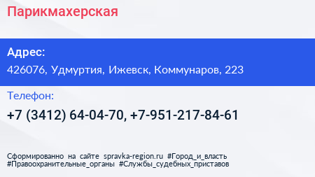 Парикмахерская по адресу 426076, Удмуртия, Ижевск, Коммунаров, 223 в дальнейшем Организация, размещена в следующих категориях: