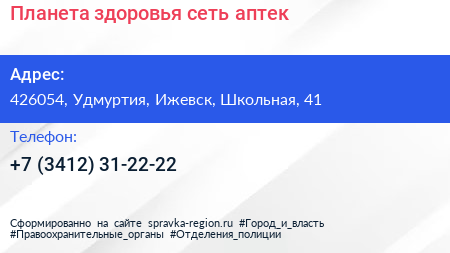 Планета здоровья, сеть аптек по адресу 426054, Удмуртия, Ижевск, Школьная, 41 в дальнейшем Организация, размещена в следующих категориях: