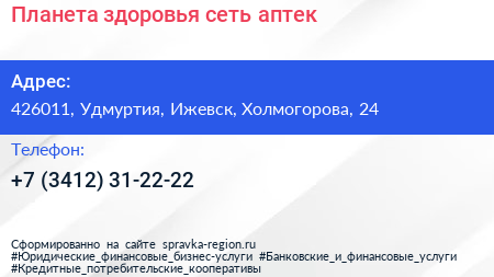 Планета здоровья, сеть аптек по адресу 426011, Удмуртия, Ижевск, Холмогорова, 24 в дальнейшем Организация, размещена в следующих категориях: