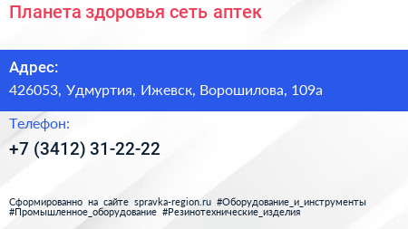 Планета здоровья, сеть аптек по адресу 426053, Удмуртия, Ижевск, Ворошилова, 109а в дальнейшем Организация, размещена в следующих категориях: