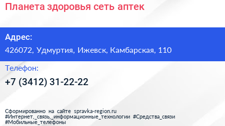 Планета здоровья, сеть аптек по адресу 426072, Удмуртия, Ижевск, Камбарская, 110 в дальнейшем Организация, размещена в следующих категориях:
