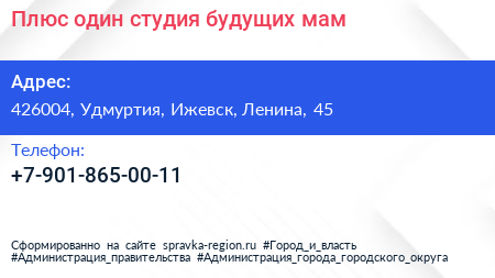 Плюс один, студия будущих мам по адресу 426004, Удмуртия, Ижевск, Ленина, 45 в дальнейшем Организация, размещена в следующих категориях: