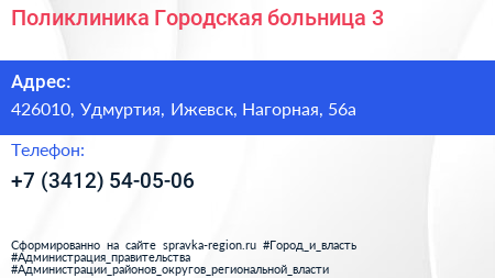 Поликлиника, Городская больница №3 по адресу 426010, Удмуртия, Ижевск, Нагорная, 56а в дальнейшем Организация, размещена в следующих категориях:
