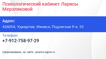 Психологический кабинет Ларисы Мерзляковой по адресу 426054, Удмуртия, Ижевск, Подлесная 9-я, 55 в дальнейшем Организация, размещена в следующих категориях: