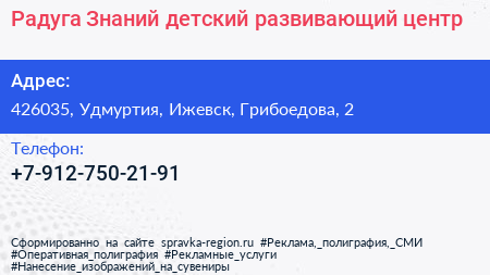 Радуга Знаний, детский развивающий центр по адресу 426035, Удмуртия, Ижевск, Грибоедова, 2 в дальнейшем Организация, размещена в следующих категориях: