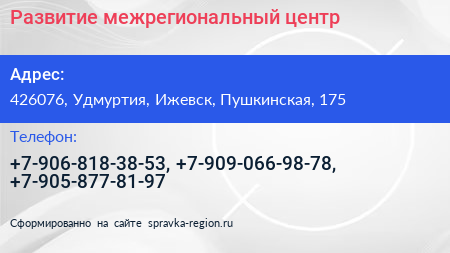 Развитие, межрегиональный центр по адресу 426076, Удмуртия, Ижевск, Пушкинская, 175 в дальнейшем Организация, размещена в следующих категориях: