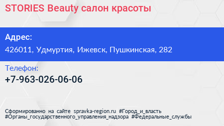 STORIES Beauty, салон красоты по адресу 426011, Удмуртия, Ижевск, Пушкинская, 282 в дальнейшем Организация, размещена в следующих категориях: