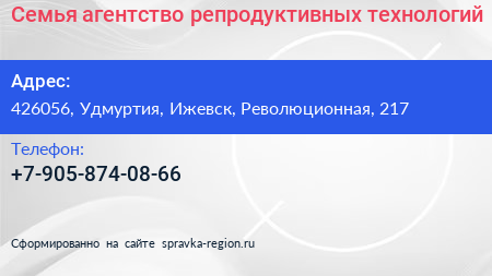 Семья, агентство репродуктивных технологий по адресу 426056, Удмуртия, Ижевск, Революционная, 217 в дальнейшем Организация, размещена в следующих категориях: