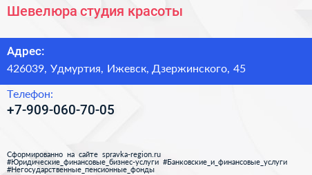 Шевелюра, студия красоты по адресу 426039, Удмуртия, Ижевск, Дзержинского, 45 в дальнейшем Организация, размещена в следующих категориях: