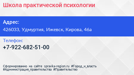Школа практической психологии по адресу 426033, Удмуртия, Ижевск, Кирова, 46а в дальнейшем Организация, размещена в следующих категориях: