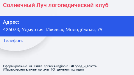 Солнечный Луч, логопедический клуб по адресу 426073, Удмуртия, Ижевск, Молодёжная, 79 в дальнейшем Организация, размещена в следующих категориях: