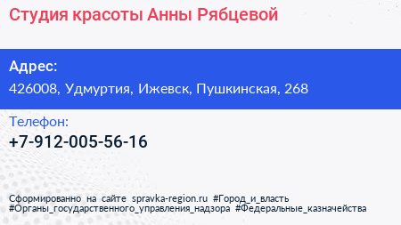 Студия красоты Анны Рябцевой по адресу 426008, Удмуртия, Ижевск, Пушкинская, 268 в дальнейшем Организация, размещена в следующих категориях: