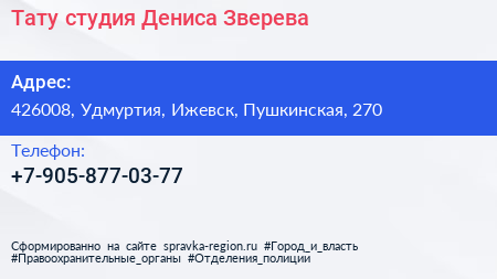 Тату-студия Дениса Зверева по адресу 426008, Удмуртия, Ижевск, Пушкинская, 270 в дальнейшем Организация, размещена в следующих категориях: