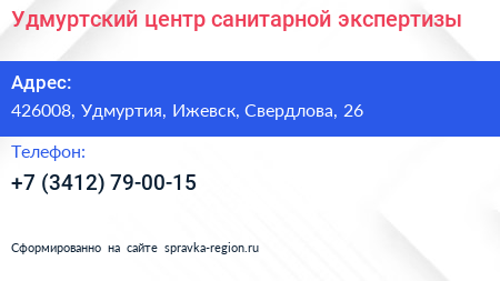 Удмуртский центр санитарной экспертизы по адресу 426008, Удмуртия, Ижевск, Свердлова, 26 в дальнейшем Организация, размещена в следующих категориях:
