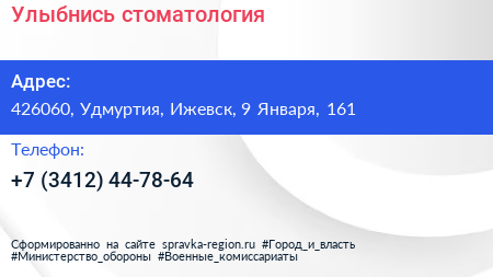 Улыбнись, стоматология по адресу 426060, Удмуртия, Ижевск, 9 Января, 161 в дальнейшем Организация, размещена в следующих категориях: