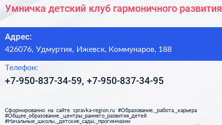 Умничка, детский клуб гармоничного развития по адресу 426076, Удмуртия, Ижевск, Коммунаров, 188 в дальнейшем Организация, размещена в следующих категориях: