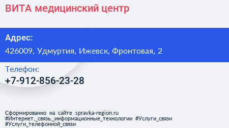 ВИТА, медицинский центр по адресу 426009, Удмуртия, Ижевск, Фронтовая, 2 в дальнейшем Организация, размещена в следующих категориях:
