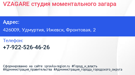 VZAGARE, студия моментального загара по адресу 426009, Удмуртия, Ижевск, Фронтовая, 2 в дальнейшем Организация, размещена в следующих категориях: