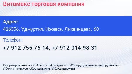 Витамакс, торговая компания по адресу 426056, Удмуртия, Ижевск, Лихвинцева, 60 в дальнейшем Организация, размещена в следующих категориях: