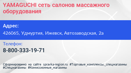 YAMAGUCHI, сеть салонов массажного оборудования по адресу 426065, Удмуртия, Ижевск, Автозаводская, 2а в дальнейшем Организация, размещена в следующих категориях: