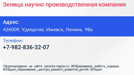 Зеница, научно-производственная компания по адресу 426009, Удмуртия, Ижевск, Ленина, 98а в дальнейшем Организация, размещена в следующих категориях: